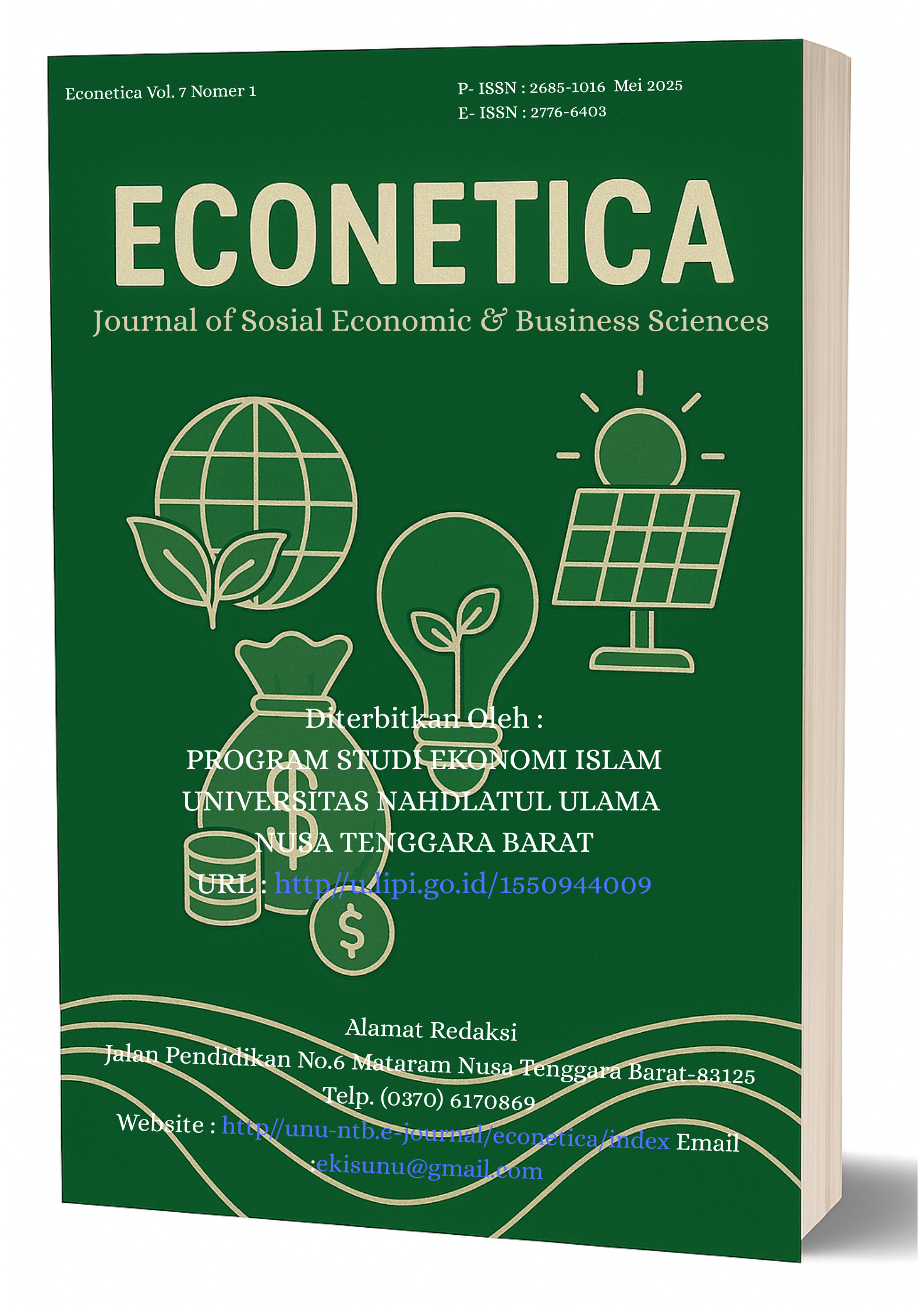 Econetica: Jurnal Sosial, Ekonomi dan Bisnis (e-ISSN: 2776-6403 | p-ISSN: 2685-1016) is a peer-reviewed and open-access academic journal published by the Islamic Economics Study Program, Faculty of Economics, Universitas Nahdlatul Ulama Nusa Tenggara Barat, Indonesia.